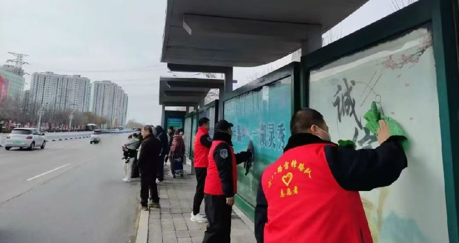 在公交候車站臺上,18路隊車長們車長們拿著抹布、鏟子、水盆等工具,擦亮了公交站牌、公益展板,擦洗了候車長凳、櫥窗,鏟除了小廣告等。為乘客提供了一個干凈、整潔、文明有序的乘車環(huán)境。