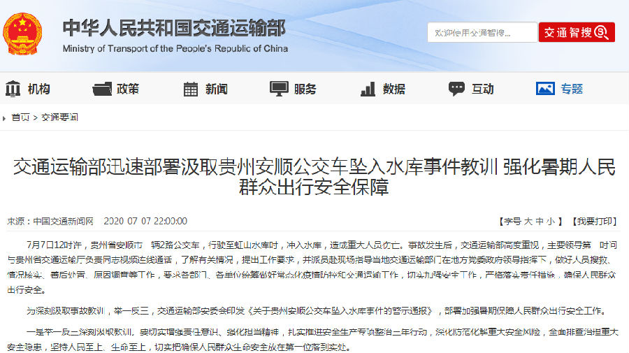 會(huì)議首先通報(bào)了7月7日“貴州安順公交車墜入水庫事件”的主要經(jīng)過和相關(guān)后續(xù)跟蹤情況,同時(shí)傳達(dá)了交通運(yùn)輸部安委會(huì)印發(fā)《關(guān)于貴州安順公交車墜入水庫事件的警示通報(bào)》中,部署加強(qiáng)暑期保障人民群眾出行安全工作的重要指示精神: