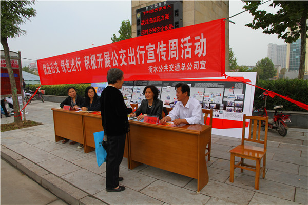 活動(dòng)期間,緊緊圍繞“優(yōu)選公交、綠色出行”這個(gè)主題,結(jié)合衡水實(shí)際情況,開展了靈活多樣的群眾性主題宣傳活動(dòng)。一、利用車載媒體及LED廣告屏播放活動(dòng)公益廣告片和宣傳語;在候車亭、首末站牌張貼公交出行宣傳海報(bào);在火車站中心樞紐站、各大公園廣場等人流密集的地方設(shè)置“公交出行周”宣傳展板;在站務(wù)室、售卡中心懸掛宣傳條幅等綜合利用各種宣傳方式大力宣傳城市公共交通對(duì)保障民生、推進(jìn)節(jié)能減排、減少空氣污染、緩解城市交通擁堵的重要意義,積極引導(dǎo)市民支持和參與城市公共交通發(fā)展。二、組織辦公室、政策研究室、售卡中心、人事勞資科、營運(yùn)服務(wù)科等相關(guān)科室在火車站中心樞紐站、各大廣場、大型換乘站臺(tái)等公共場所設(shè)立公交咨詢臺(tái),宣傳公交并解答市民關(guān)于公交IC卡優(yōu)惠政策、公交司機(jī)招聘、線路運(yùn)營、公交政策等方面的問題。同時(shí),制作并發(fā)放了“征求意見卡”,以此來廣泛征集市民對(duì)公交線路優(yōu)化、服務(wù)時(shí)間、班次密度安排、車廂衛(wèi)生狀況、司乘人員服務(wù)態(tài)度等方面的意見和建議,為提升公交服務(wù)質(zhì)量和乘客滿意度征集寶貴的第一手資料。三、加強(qiáng)輿論宣傳報(bào)道;顒(dòng)期間邀請(qǐng)衡水廣播電視臺(tái)、衡水交通廣播臺(tái)等新聞媒體的記者同志們到現(xiàn)場實(shí)地報(bào)道“公交出行宣傳周”活動(dòng)實(shí)施情況。通過各種新聞媒體報(bào)道,為“優(yōu)先發(fā)展城市公交”營造良好輿論氛圍。四、結(jié)合“百日優(yōu)服競賽”“衡水湖馬拉松比賽用車優(yōu)服培訓(xùn)”等活動(dòng),積極開展形式多樣的服務(wù)質(zhì)量、服務(wù)技能競賽和崗位練兵活動(dòng)。