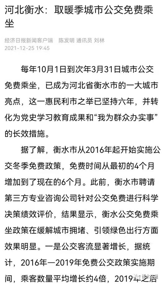 ◆◆《經(jīng)濟(jì)日報(bào)》發(fā)表了題為《河北衡水:取暖季城市公交免費(fèi)乘坐》的文章,文章從績效評(píng)價(jià)角度進(jìn)行分析,認(rèn)為衡水公交免費(fèi)政策對衡水市空氣質(zhì)量不斷提升發(fā)揮了積極作用,是政府將改革紅利轉(zhuǎn)化為黨史學(xué)習(xí)教育成果和“我為群眾辦實(shí)事”的長效措施。